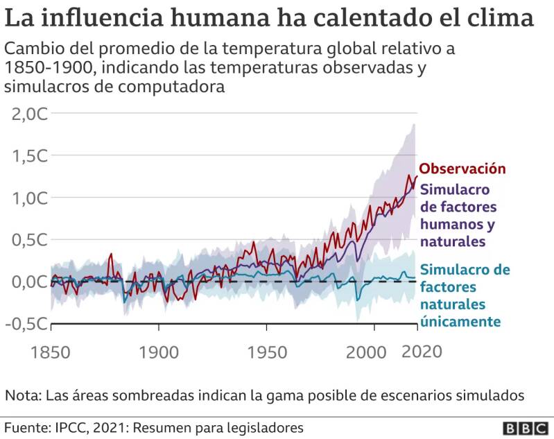 Los autores del estudio dicen que, desde 1970, las temperaturas de la superficie global han aumentado más rápido que en cualquier otro período de 50 años durante los últimos 2.000. Este calentamiento "ya está afectando a muchos fenómenos meteorológicos y climáticos extremos en todas las regiones del mundo", aseguran. Ya sean olas de calor como las experimentadas recientemente en Grecia y el oeste de América del Norte, o inundaciones como las de Alemania y China, "su atribución a la influencia humana se ha fortalecido" durante la última década.